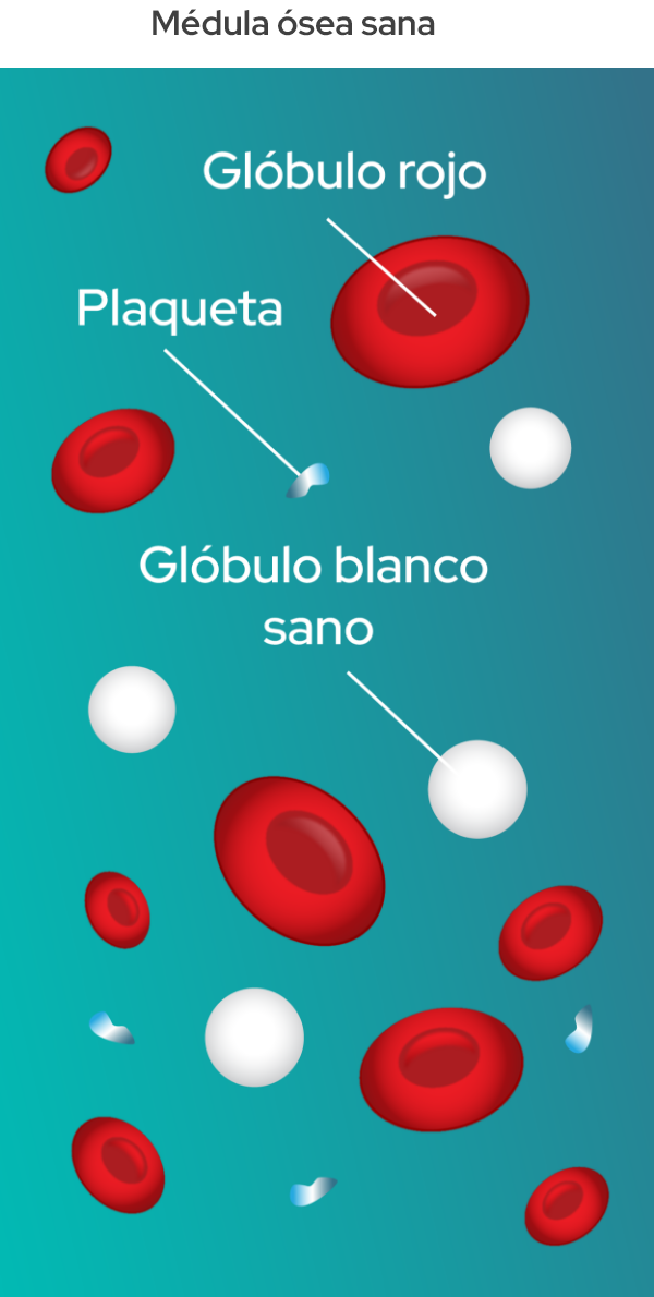 Las plaquetas son fragmentos de células que tapan hoyuelos en los vasos sanguíneos y ayudan a detener el sangrado. Cuando se padece de AML, las células cancerosas no se destruyen cuando deben. En lugar de esto, se multiplican y se acumulan en la médula ósea y, a la larga, desplazan las células sanas normales.