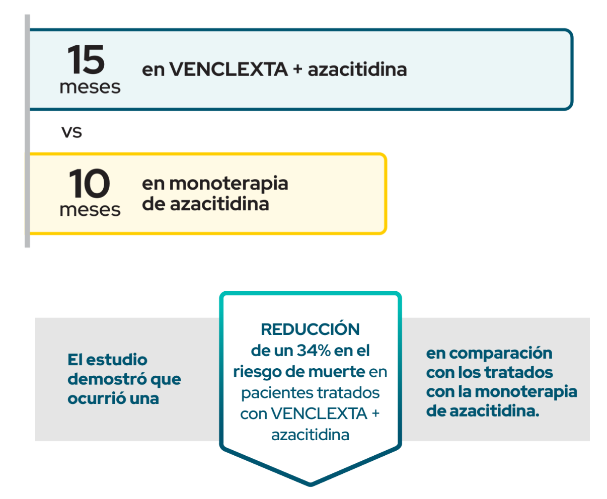 La mitad de los pacientes tratados con VENCLEXTA + azacitidina permanecieron vivos a los 15 meses vs. a los 10 meses en los que recibieron la monoterapia de azacitidina.