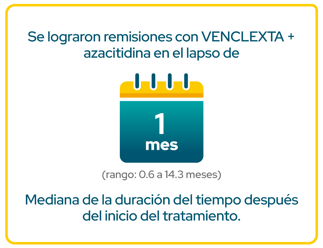 En el estudio clínico, la mediana del tiempo para que los pacientes lograran algún nivel de remisión fuese para CR o CRh fue 1 mes (con un rango de 0.6 a 14.3 meses). Recuerde, VENCLEXTA funciona de manera distinta en cada cual. El tiempo que tarda en funcionar y por cuánto tiempo duran los efectos pudiera variar de una persona a otra.