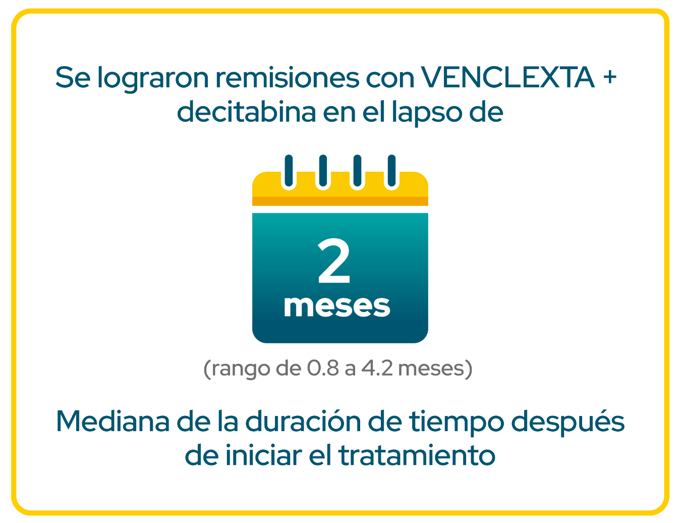 En el estudio clínico, la mediana del tiempo para que los pacientes lograran algún nivel de remisión ya sea para CR o CRh fue 2 meses (con un rango de 0.8 a 4.2 meses). Recuerde, VENCLEXTA funciona de manera distinta en cada cual. El tiempo que tarda en funcionar y por cuánto tiempo duran los efectos pudiera variar de una persona a otra.