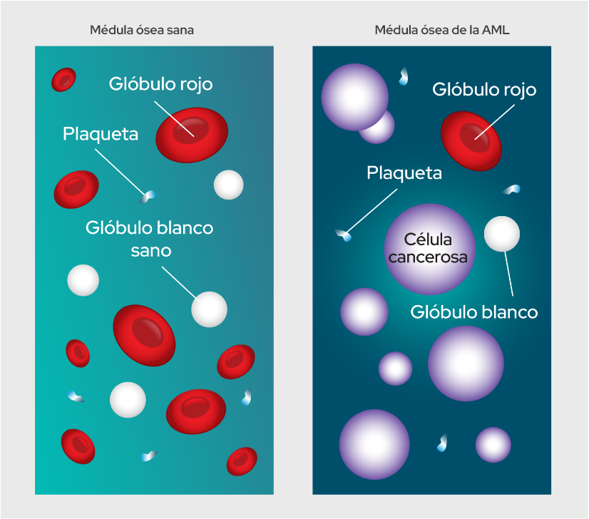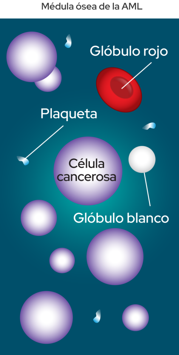 Leucemia mieloide aguda (AML) es un tipo de cáncer de la sangre que comienza en la médula ósea. Por lo regular, la médula ósea sana está compuesta de muchos tipos de células, entre ellas, glóbulos rojos, glóbulos blancos y plaquetas.